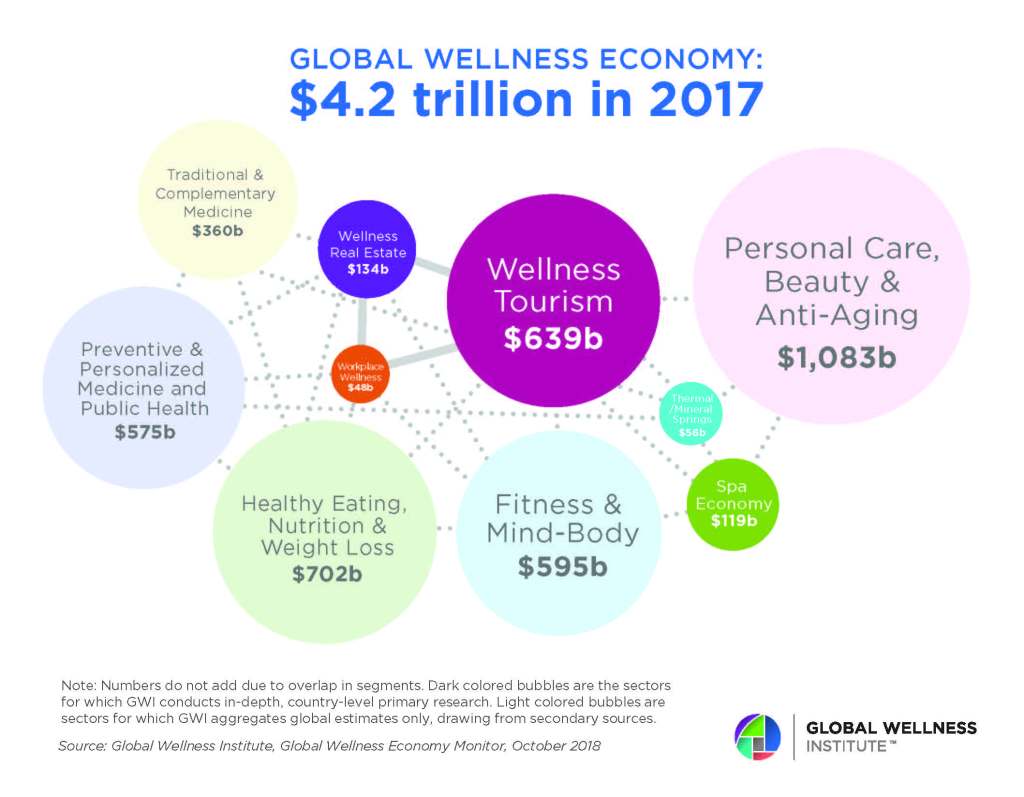 The Miami-based Global Wellness Institute (GWI) researched and published a report on the industry in 2018, bridging wellness perspectives and discussions with global business opportunities. Their research results included the following points: